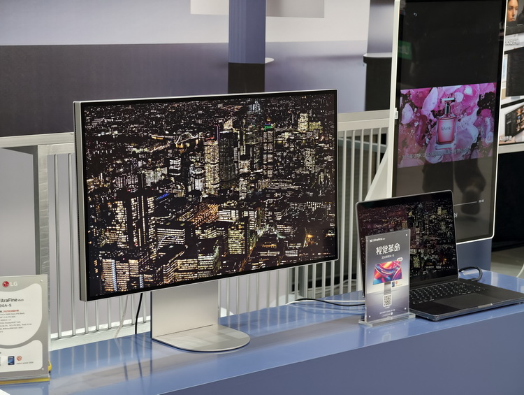 在进入体验店二层,一下子会被LG新款显示器吸引眼球,尤其是位于C位、连接着MacBook的UltraFine evo 32U990A-S显示器。不用多说,熟悉显示器的朋友都知道LG与苹果的关系有多密切,在苹果笔记本电脑中LG32U990A-S甚至被识别为Pro Display XDR。而在硬件方面,显示器采用了31.5英寸LG Display Nano IPS Black面板,分辨率为6144×3456(16:9),像素密度达200ppi,支持原生10bit色深,色域覆盖99.5% Adobe RGB以及98% DCI-P3,还内置了硬件校准接口,支持Calman校色软件,出厂ΔE