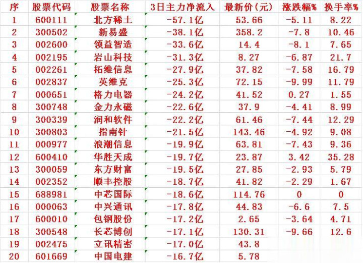 序 股票名称 3日主力净流入